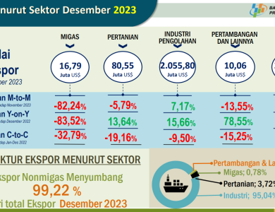BPS Jatim juga mencatat, neraca perdagangan Jawa Timur selama bulan Desember 2023 kembali mengalami defisit yaitu sebesar 489,14 juta Dolar AS. Hal ini disebabkan oleh adanya defisit nilai perdagangan pada sektor migas yang lebih tinggi dibandingkan surplus pada sektor nonmigas.