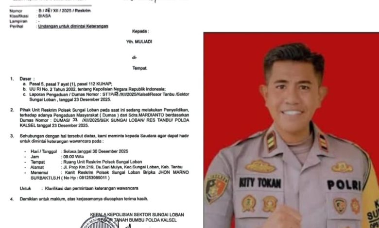 Undangan untuk dimintai Keterangan bernomor B/28/XII/2025/Reskrim, diminta kepada Muliadi dapat berhadir memberikan Keterangan wawancara pada hari Selasa tanggal 30 Desember 2025 pukul 09.00 Wita di Ruang Unit Reskrim Polsek Sungai Loban beralamat di Jl. Prop Km.219 Desa Sari Mulya Kec. Sungai Loban Kab. Tanah Bumbu agar menemui Kanit Reskrim Polsek Sungai Loban Bripka JHON MARNO SURBAKTI, S.H. nomor Handphone 081253989011.