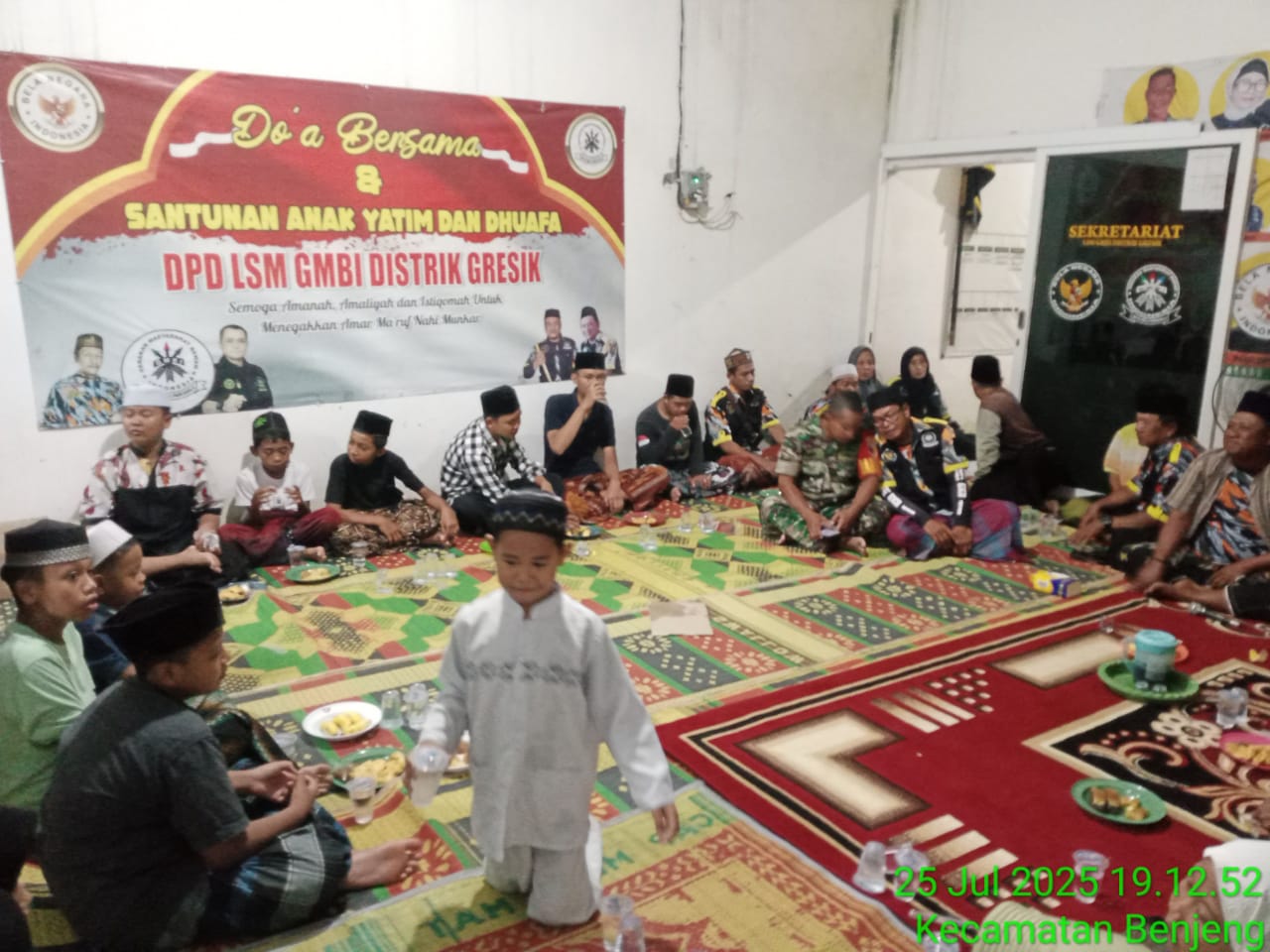 Anak yatim di sekitaran metatu ini merupakan di dekat kantor sekretariat LSM GMBI distrik Gresik, puluhan anak-anak yatim yang berusia 6-15 tahun. Secara berkelanjutan mereka mendapatkan santunan di tiap hari jumat malam.(25.07/2025)
