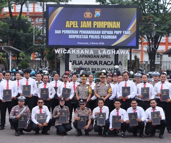 Pasuruan||LiputanKasus.com – Polres Pasuruan menggelar Apel Pagi Jam Pimpinan yang dirangkaikan dengan pemberian penghargaan kepada Pegawai Negeri pada Polri (PNPP) berprestasi, Senin (2/3/2026) pukul 08.00 hingga 08.50 WIB. Kegiatan berlangsung di Lapangan Apel Sarja Arya Racana dan dipimpin langsung oleh Kapolres Pasuruan, AKBP Harto Agung Cahyono.
