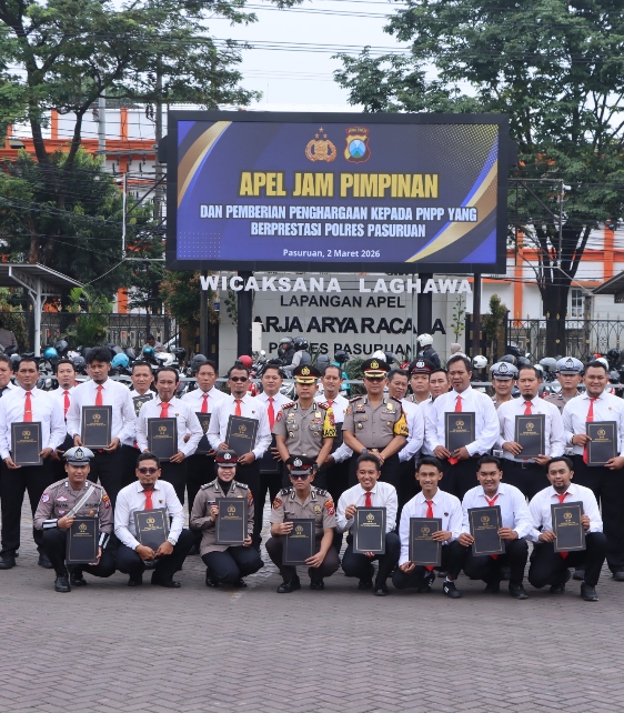 Pasuruan||LiputanKasus.com – Polres Pasuruan menggelar Apel Pagi Jam Pimpinan yang dirangkaikan dengan pemberian penghargaan kepada Pegawai Negeri pada Polri (PNPP) berprestasi, Senin (2/3/2026) pukul 08.00 hingga 08.50 WIB. Kegiatan berlangsung di Lapangan Apel Sarja Arya Racana dan dipimpin langsung oleh Kapolres Pasuruan, AKBP Harto Agung Cahyono.