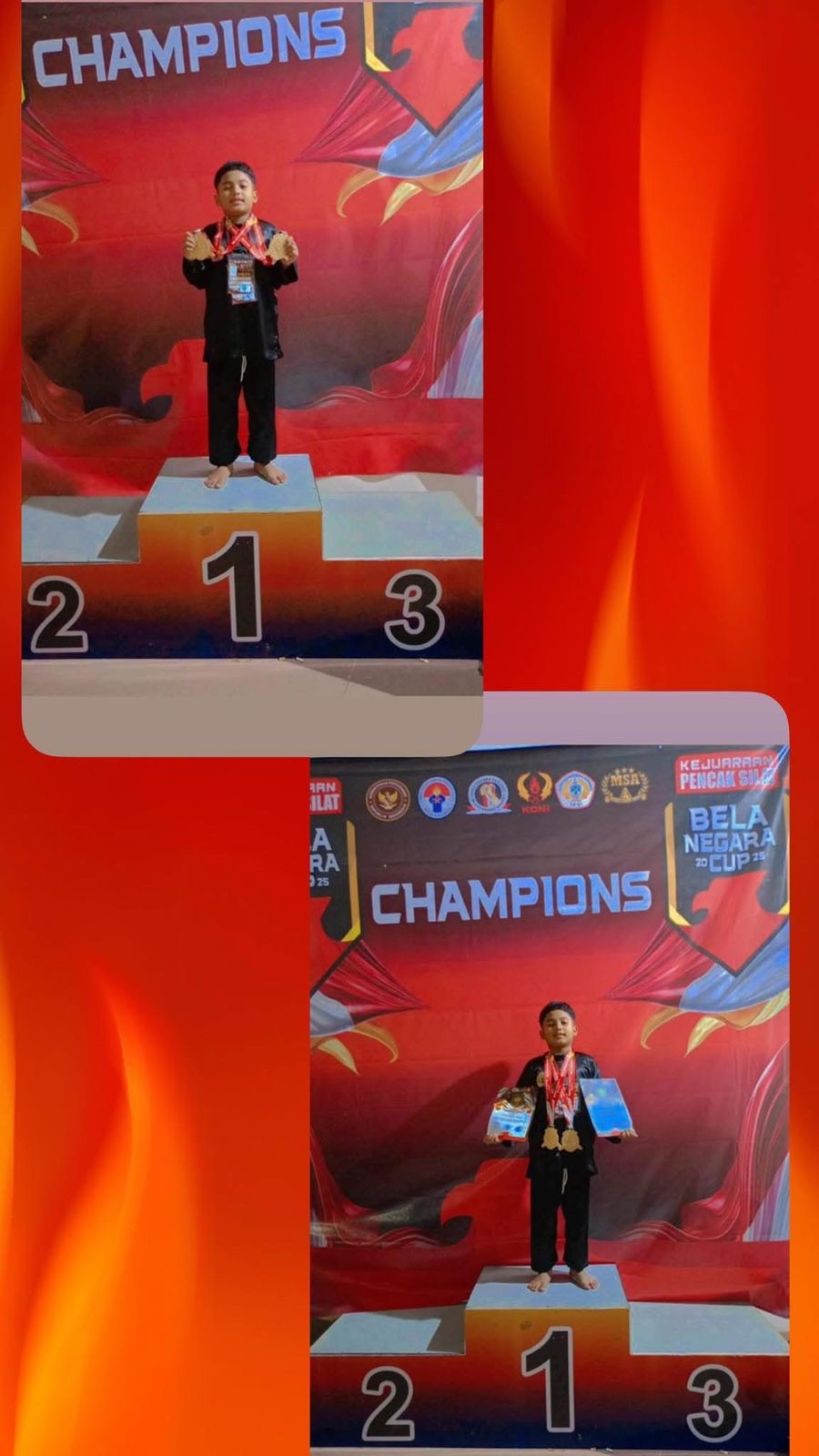 Juara 1 tunggal dengan tangan kosong ( tanpa senjata )usia dini 2 putra