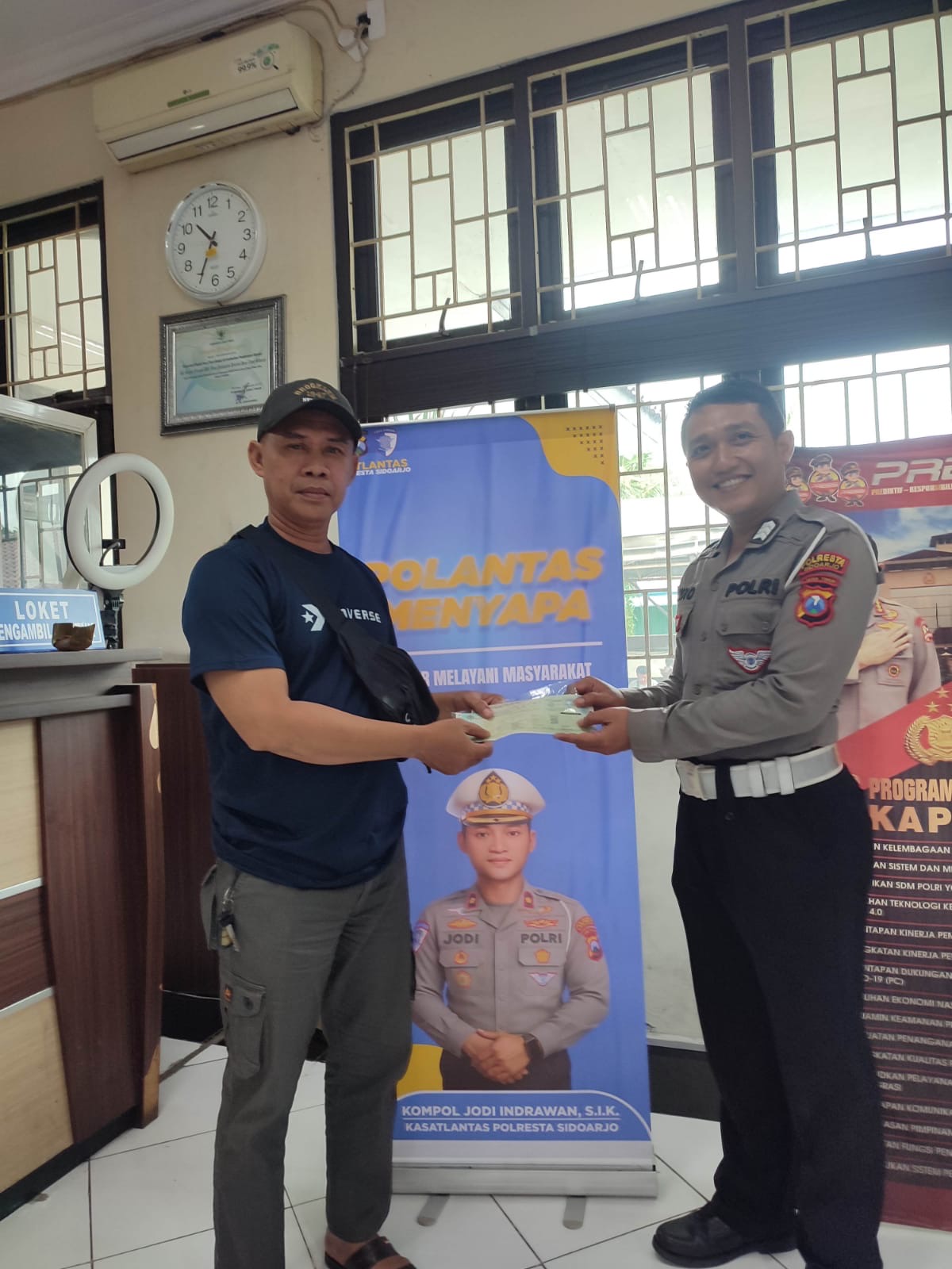 “Komitmen Satlantas Polresta Sidoarjo dalam memberikan Program Polantas Menyapa ” Pelayanan akan terus dilakukan, dengan mengedepankan prinsip cepat, mudah, dan transparan pelayanan kepada masyarakat di samsat Sidoarjo ,ujarnya