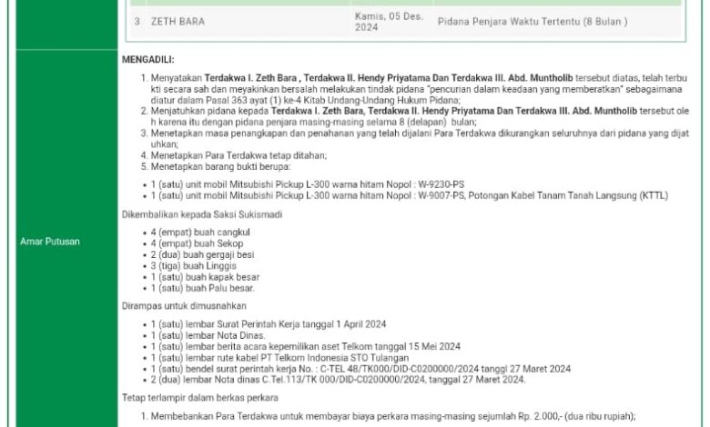 Sidoarjo||Liputankasus.com – Penanganan kasus pencurian Kabel Tanam Tanah Langsung (KTTL) atau kabel primer milik PT. Telkom Indonesia oleh Satreskrim Polresta Sidoarjo mulai menuai sorotan tajam. Dari belasan orang yang terlibat dalam kejahatan ini, hanya tiga terdakwa yang diadili di Pengadilan Negeri (PN) Sidoarjo.