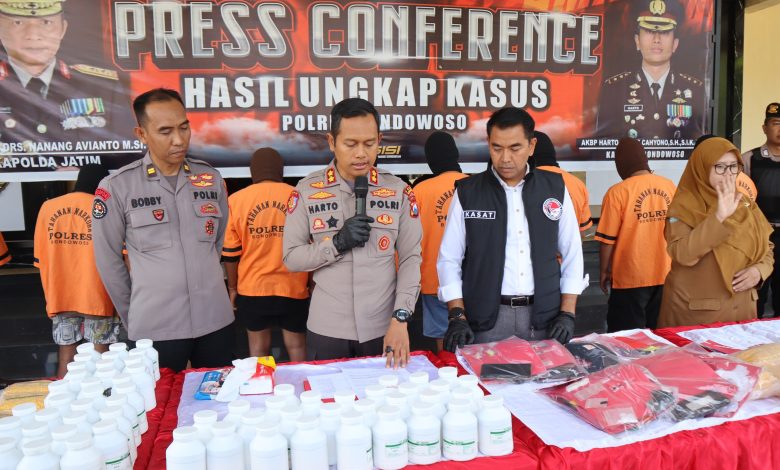 Kapolres Bondowoso AKBP Harto Agung Cahyono didampingi Kasat Narkoba, AKP Deky Julkarnain dan Kasi Humas, Iptu Bobby Dwi Siswanto mengatakan dari hasil pengungkapan itu Polisi mengamankan 11 tersangka.