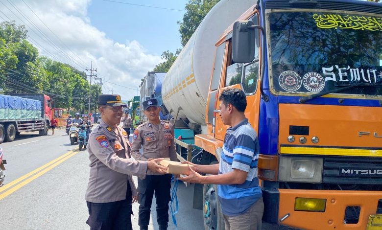 Polisi Peduli : Polresta Banyuwangi Berbagi Nasi Kotak untuk Sopir Truk di Jalur Pelabuhan Ketapang
