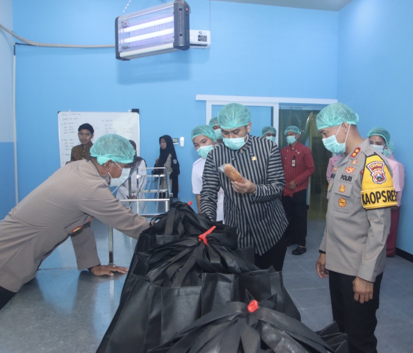 Sebelum didistribusikan, Tim Food Security dari Dokkes Polres Blitar Kota melaksanakan uji kelayakan makanan menggunakan tes kit.
