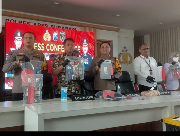 Dalam acara confrensi pres reales hari ini dihadirkan oleh Kapolrestabes Surabaya Kombes Pol Pasma Royce didampingi oleh RS Dr Soetomo Prof Dr Cita Rosita Sigit Prakoeswa diwakili oleh Dr. Heni, Kasatreskrim AKBP Hendro dan Kabid labfor Kombes Pol Sodiq Pratomo