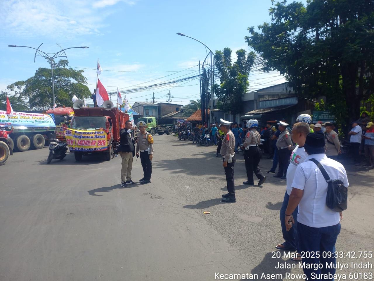 Demi menjaga kondusifitas jalur lalulintas yang tertib saat terjadi aksi penolakan peraturan pembatasan kendaraan angkutan barang selama 16 hari selapma Operasi ketupat Semeru 2025 yang dilakukan oleh Asosiasi Pengusaha Truck Indonesia (Aptrindo) Tanjung Perak, para petugas korp berbaju coklat melakukan pengamanan dan pengawalan yang dimulai dari Jalan Margomullyo hingga Jalan Dupak Demak.